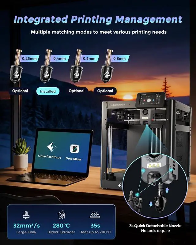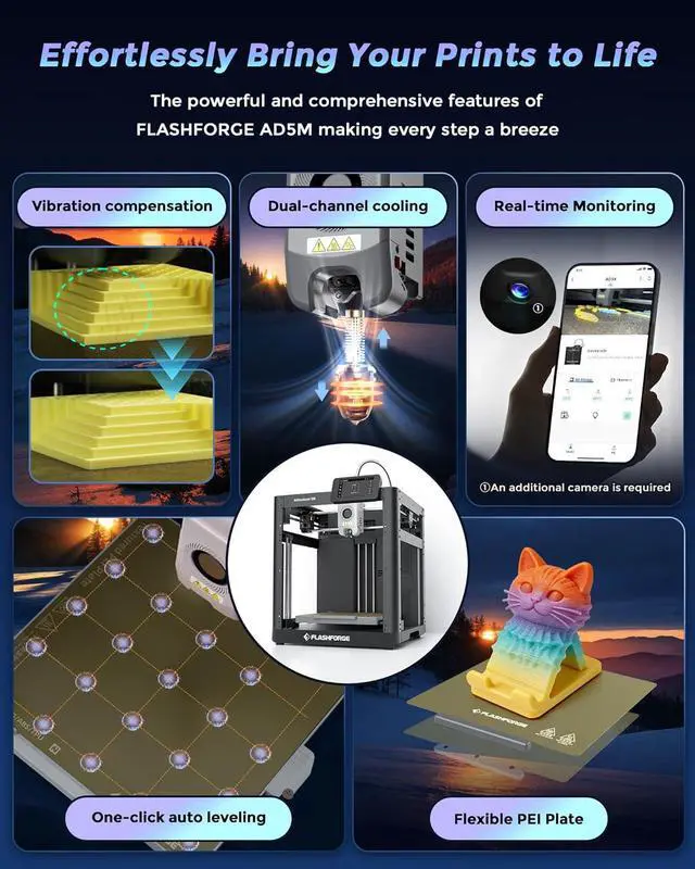 Multi-Device Management: With Flash Maker and Orca-Flashforge,FLASHFORGE 3D Printer AD5X allow users manage hundreds of printers remotely,real-time monitoring of print progress(need to add an additional camera kit),adjust parameters, receiving message alerts,and enjoy freedom in managing filament colors and types