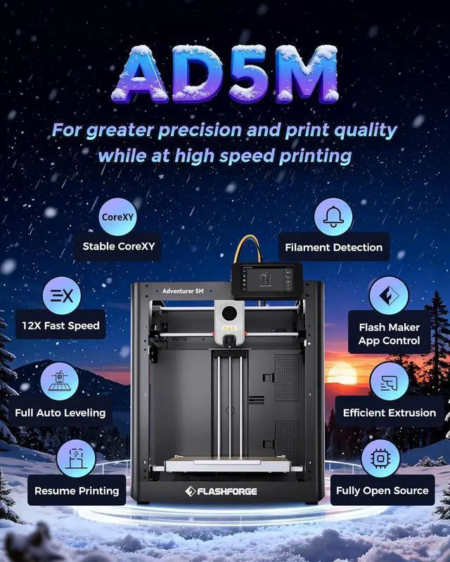 FLASHFORGE Adventurer 5M 3D Printer,600mm/s Max Speed Core XY 3D Printers with Auto Leveling,280°C Direct Extruder,3s Quick Swap Nozzle,Dual-Sided PEI Platform,DIY AD5M Enclosure,for Kids,Beginners