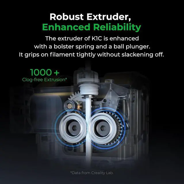 Robust Extruder & Packing a PunchThe direct drive extruder of creality 3d printer ender 3 v3 plus is enhanced by a bolster spring and a ball plunger. 1000h+* Clog-free Extrusion, it grips the filament tightly without slackening off. Side spring, bolstering the grip of extruding gears.Powder metallurgy lever, hard to deform, keeping the extrusion force.