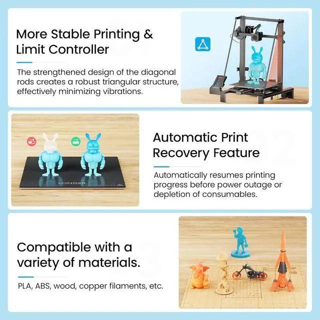 Maximum Build Size & Material CompatibilityUnlock boundless creativity with Longer LK5 Pro 3D printer, featuring a maximum build size of 11.8" x 11.8" x 15.7" (300*300*400mm). Enjoy a larger canvas for your 3D printing projects, providing more room for innovation. This printer is designed to be compatible with a variety of printing materials, ensuring it meets the diverse needs of your 3D printing endeavors.