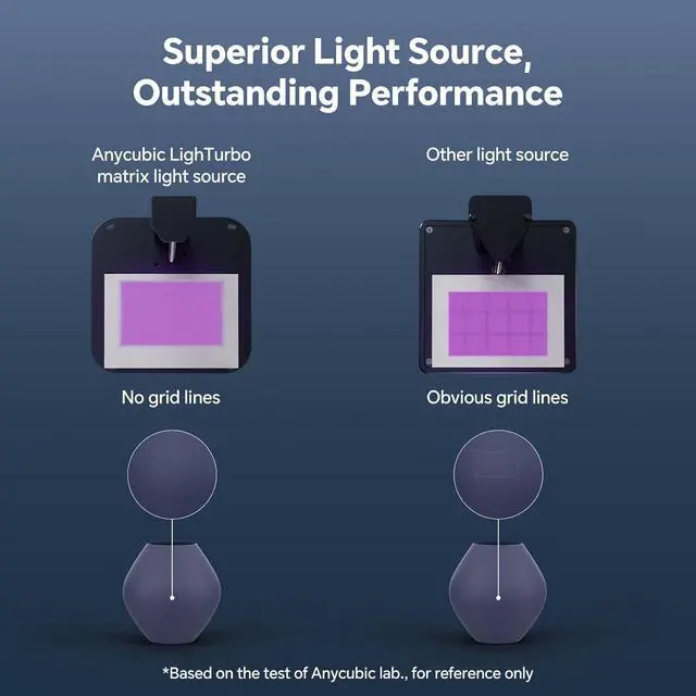 Stabilized Light SourceAnycubic LighTurbo matrix light source system ensures ultra-stable layer curing for smoother surfaces and near-invisible layer lines. Achieve rapid 1.5-second exposures print faster without sacrificing detail