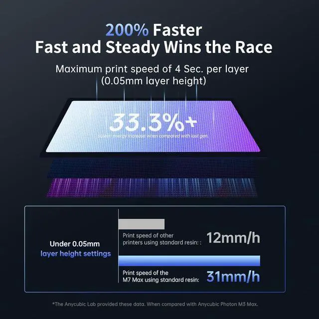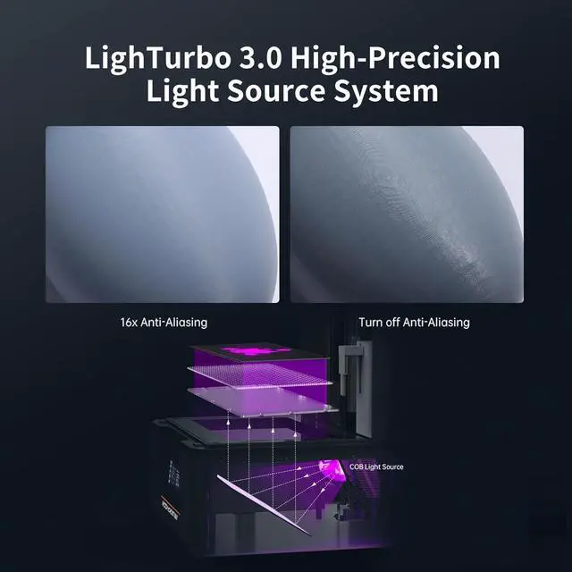 Stabilized Light SourceAnycubic LighTurbo matrix light source system ensures ultra-stable layer curing for smoother surfaces and near-invisible layer lines. Achieve rapid 1.5-second exposures print faster without sacrificing detail