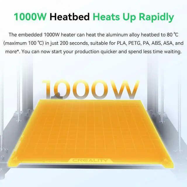1000W HeatbedThe embedded 1000W heater can heat the aluminum alloy heatbed to 80 (maximum 100 ) in just 200 seconds, suitable for PLA, PETG, PA, ABS, ASA, and more. You can now start your production quicker and spend less time waiting.