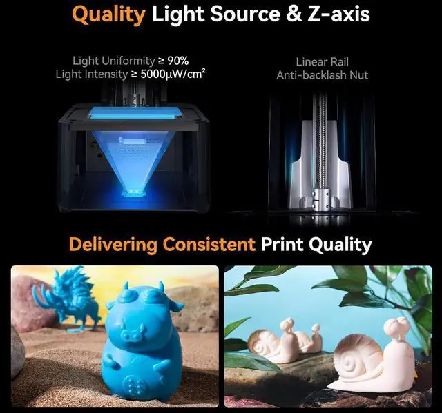 Integral Light Source: Creality 3d resin printer R6 is equipped with an integral light source only available in high-end products, with light source uniformity >90%, uniform and stable light, better overall consistency when curing each layer of the model, and smoother and more delicate models printed out; The orange coated top cover can shield 99.89% of UV rays, safer and more eye-friendly