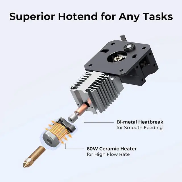 HOTEND with 60W CERAMIC HEATER - This Ender 3 V3 KE 3D printer features a 60W ceramic heater that can fully melt filaments for high-speed printing, a bi-metal (copper+titanium alloys) heartbreak that effectively prevents thermal creep, and a copper nozzle that enables 300°C* printing