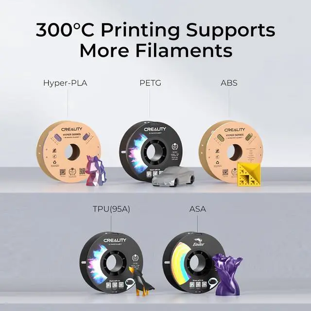 300 PRINTING SUPPORTS MORE FILAMENTS - Creality 3D printer can handle Hyper PLA, PETG, ABS, TPU(95A) and ASA filaments. Pick the right one to print whatever daily item, part, or product you like