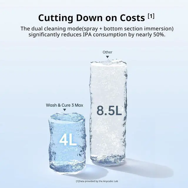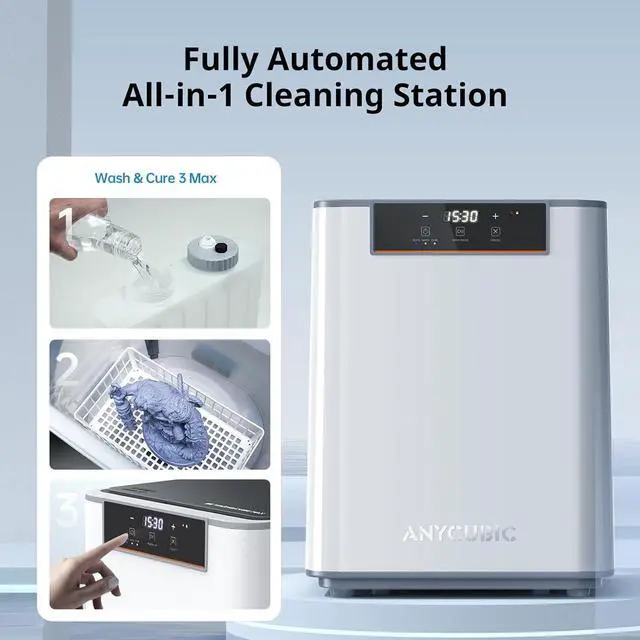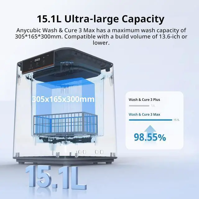 Higher CompatibilityAnycubic Wash and Cure 3 Plus upgraded the washing size 8.97''x5.03''x10.23''. And compared with Wash & Cure Plus, the washing volume of the washing basket is increased by about 13.4% to 7.6L, which is suitable for more LCD 3D printers like Photon Mono M5s, Photon Mono M7 Pro, Saturn 3/4 series or other 10.6 inches and below.