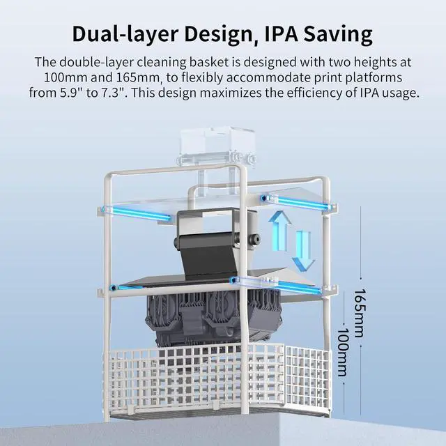 Efficient IPA utilizationThe dual-layer PP material cleaning basket supports washing with platform and rust-resistant. It is equipped with two adjustable heights of 150 mm and 250mm allowing printing platforms from 6.6 to 10.6 inches, maximizing alcohol usage efficiency.