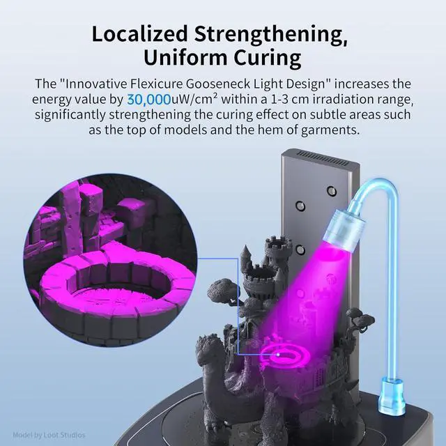 Flexicure Gooseneck LightDue to the innovative Flexicure gooseneck light design, Wash & Cure 3 Plus can increase the energy value by 30,000uW/cm²* in the 1~3cm irradiation range, which greatly enhances the solidification effect of the top of the model, the figure skirt, and other subtle areas, plus the light tube can be twisted, making it more convenient to use