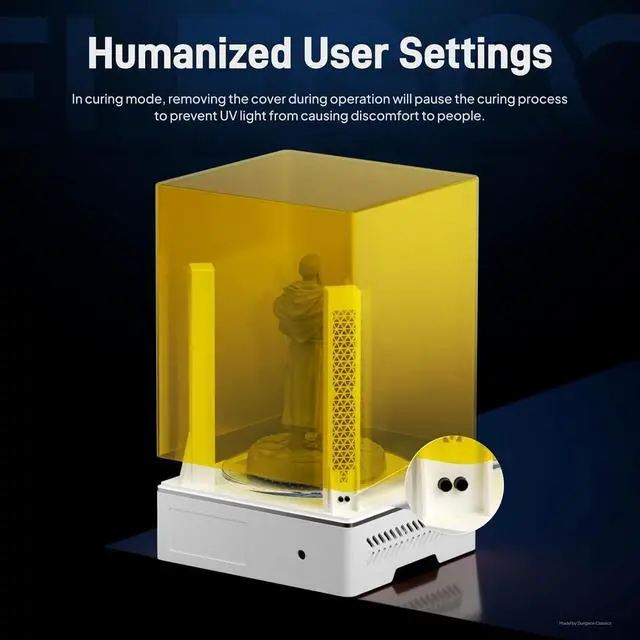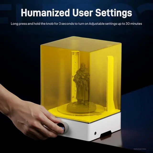 Easy and intuitive operationWith a single knob, just press and hold to turn on the machine, then rotate the knob to set an appropriate time for washing or curing, and your models will be ready in a short time. The UV cover can block 99.9% of ultraviolet rays and protect your eyesight during post-curing.
