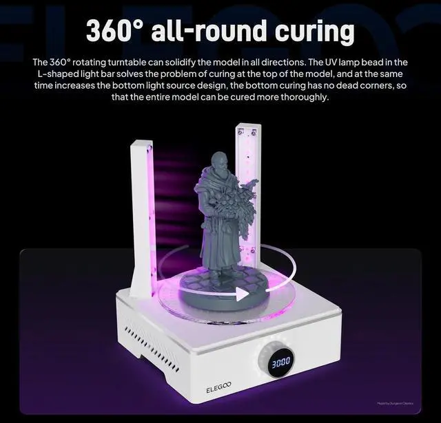 360° all-round exposureThe post-curing Machine adopts 2 L-shape light bars (each built-in 14 UV LED lights), and added 4 UV LED beads beneath the turntable. Work with 360°auto-rotating turntable and a handheld UV lamp that cures the nooks and crannies and interior of 3D prints, so that the entire model is cured thoroughly without dead ends.