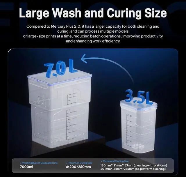 Large washing volumeWith an 7000ml large capacity sealed water tank, you can directly wash large models printed by ELEGOO Saturn and Mars 3, or clean parts in batches, which offers substantial time savings and improves your productivity.