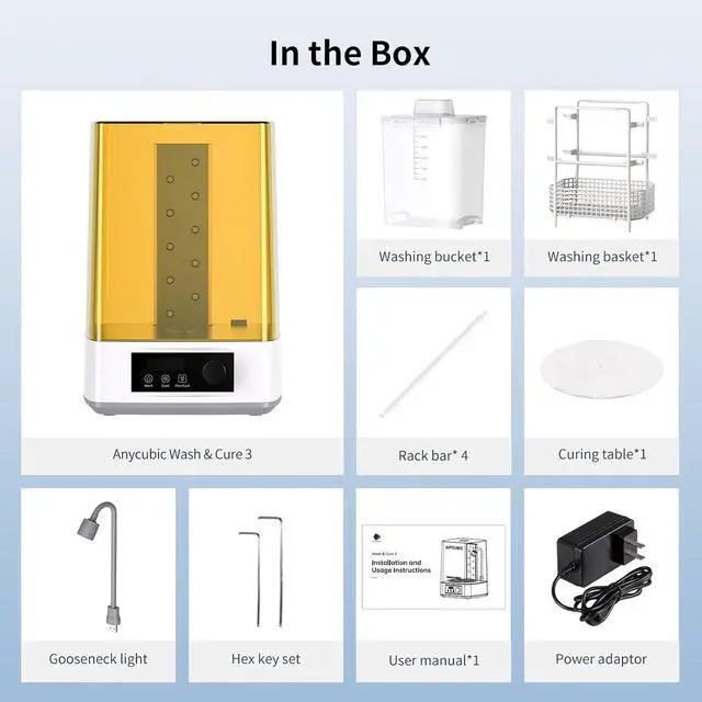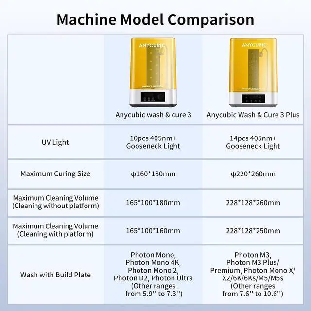 1. Higher CompatibilityAnycubic Wash and Cure 3 Plus upgraded the washing size 8.97''x5.03''x10.23''. And compared with Wash & Cure Plus, the washing volume of the washing basket is increased by about 13.4% to 7.6L, which is suitable for more LCD 3D printers like Photon Mono M5s, Photon Mono M7 Pro, Saturn 3/4 series or other 10.6 inches and below.