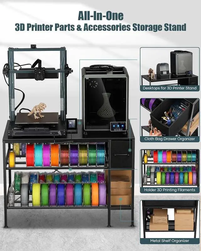 Multi-Functional 3D Printer Stand: Designed to provide the ultimate organization for your 3D printing equipment, this stand features a spacious tabletop to securely hold your 3D printer while offering ample storage for filament spools, accessories, and parts.
