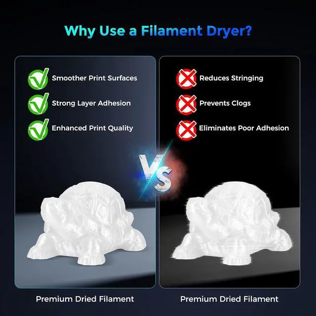 Fast Drying, Wide Compatibility Reaches up to 80°C, saving half the time compared to standard 70°C dryers. Compatible with a wide range of filaments, including PLA, PETG, ABS, TPU, and Nylon.