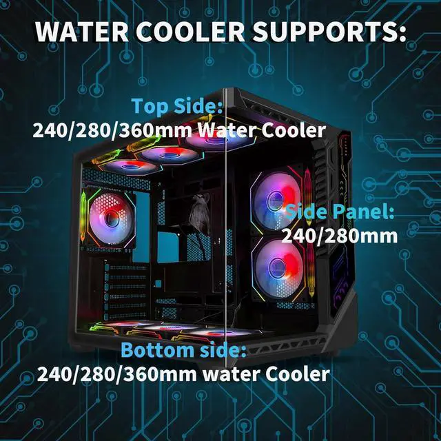 * Big Space: PU Cooler Height Support 175mm, Graphic Card Length Max 410mm, The Gaming Case is 295mm Width,Huge Inner Space for ATX Using,Top Side Support 360 Water Cooler; C; ATX Case with dust-proof cover on both the top and bottom,Compatibility with large graphics cards, and ease of installation.