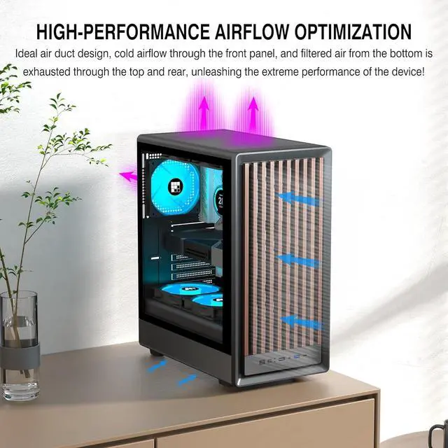 High Performance CoolingM1 comes pre-installed with 4 ARGB PWM fans, and the glass side panel adopts a snap-on design, which can be quickly removed without tools, bringing convenient installation and heat dissipation experience. The front, rear, top, and bottom fan mounting points of your PC case can accommodate up to eight 120mm fans, ensuring optimal cooling performance for your PC case