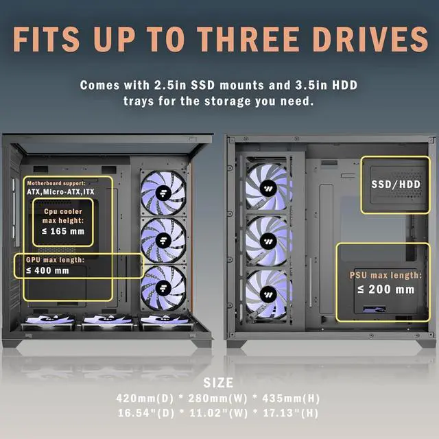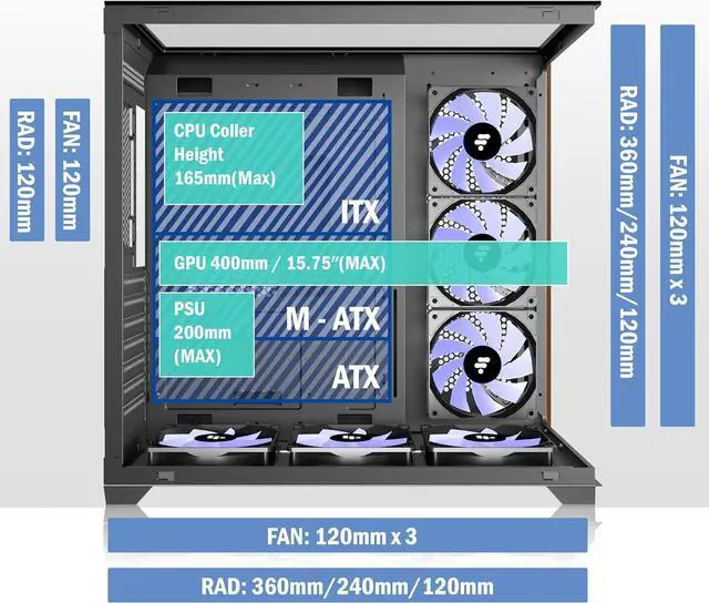 [Remarkable Expansion]-- (1)The Mid Tower Gaming Computer Case supports ATX / Micro-ATX / Mini-ITX motherboards.(2) Support 360mm Radiator (3) CPU cooler height maximum 165MM (4) GPU length maximum 400MM (5) Power supply type ATX up to 200MM (6) Equipped with HDD and SSD trays (7) Expansion PCIE-Slots 7 (8)Fits up to 7x 120mm Case Fans and 3 x simultaneous radiators..