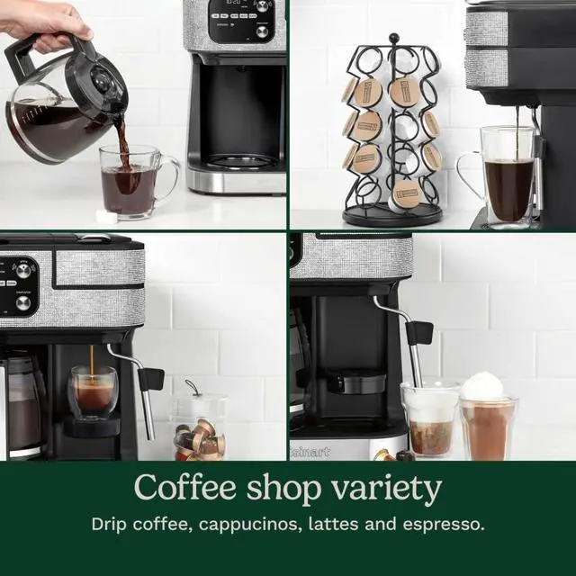 1. 4-IN-1 BARISTA BAR: The Cuisinart Coffee Center Barista Bar 4-in-1 Coffee Maker lets you enjoy up to 12 cups* of coffee (*cup equals approx. 5 oz. (varies by brewing technique) and single-serve cappuccinos, lattes, and espresso.)