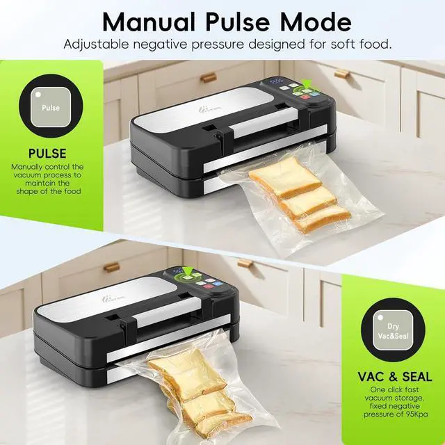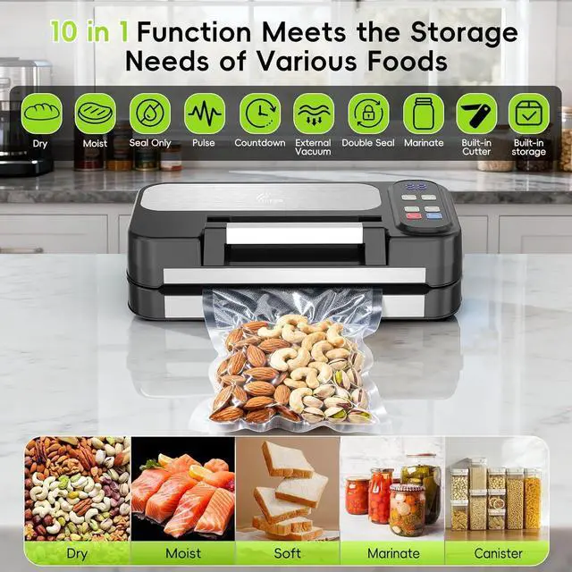 10-in-1 Multifunctional Sealer with Wet, Dry & Pulse Modes: More than just a vacuum sealer, this all-in-one machine covers every kitchen need. Switch between Dry Mode for snacks and grains, Wet Mode for juicy meats and seafood, and Pulse Mode for fragile foods like chips or baked goods. It even includes a Marinating Function for rapid flavor infusion and External Vacuum Extraction for jars, canisters, and wine bottlesgiving you ultimate versatility in one device.