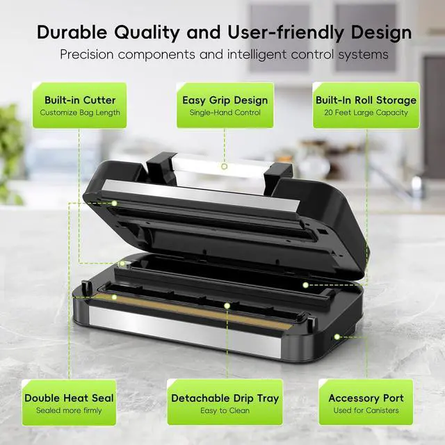 Fast, Easy & One-Hand Operation: Featuring an easy-lock handle and digital countdown display, sealing has never been simpler. Achieve a secure seal in as little as 520 seconds with just one hand, while the built-in cutter makes custom-sized bags in seconds. The compact design also includes built-in storage for bags and accessories, keeping your kitchen organized and ready for use.