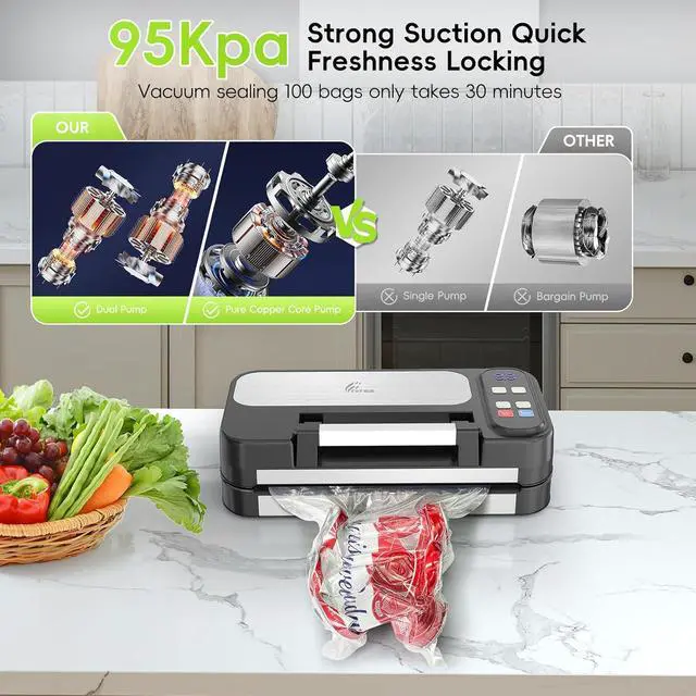Powerful 95KPA Suction & Smart Pressure Control: Engineered with dual high-performance pumps, this vacuum sealer delivers up to 95KPA of suction strengthquickly removing air to lock in freshness and extend food storage up to 10× longer. The intelligent pressure system automatically adjusts for different food textures, from delicate pastries to dense cuts of meat, ensuring optimal sealing every time.