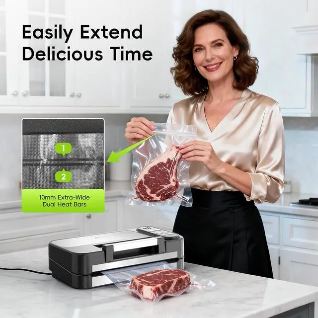 Upgraded Double Heat Seal & Extra-Wide 12.2" Sealing Strip: Designed with a professional-grade double heat seal, this unit prevents leaks and secures long-term storage, even for moist foods. The 12.2" wide sealing bar allows multiple small bags to be sealed at once or extra-large cuts of meat to be packed in a single bag - saving both time and bags.