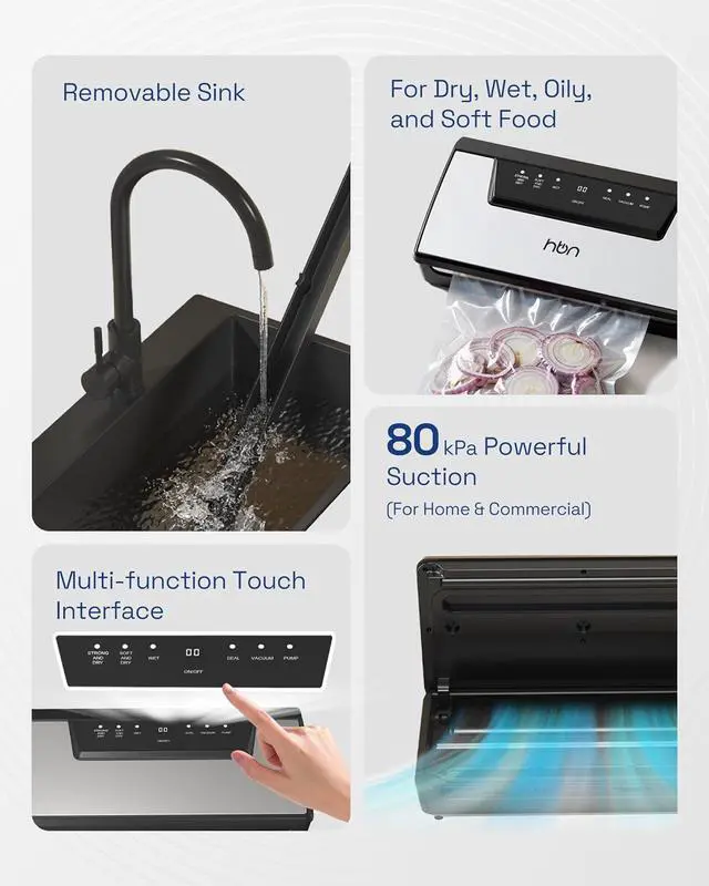 Smart Screen & SUS Stainless Steel CoverSmart touch screen and SUS stainless steel top give this food vacuum sealer a sleek, durable look that fits modern kitchens & shops. Perfect as a digital vacuum sealer for daily use, meal prep, and freezer storage.