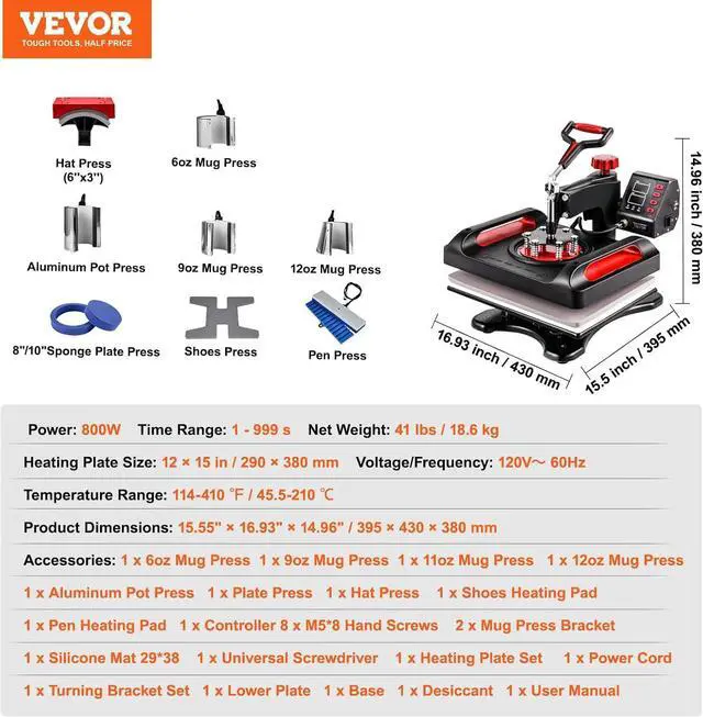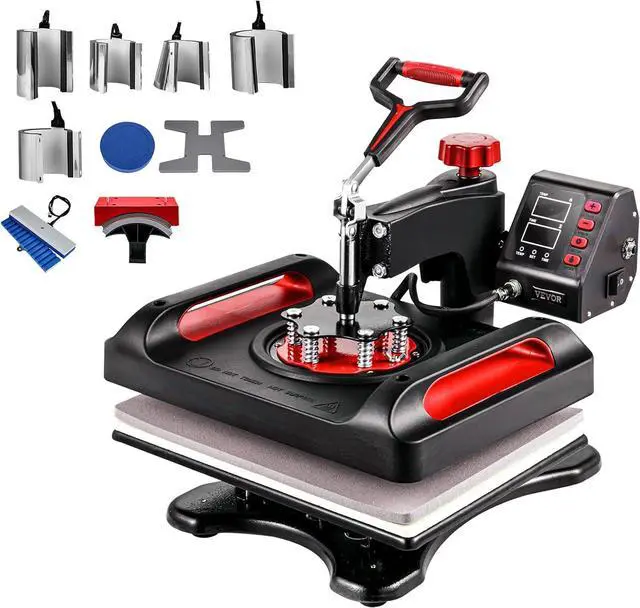 VEVOR 11 in 1 Heat Press, 12 x 15 Inch, Multifunctional Clamshell Printer, Digital Dual-Tube Heat Press Transfer Machine, Swing Away Sublimation Machine for T-Shirt Hat Cap Mug Plate Pen Shoes Black
