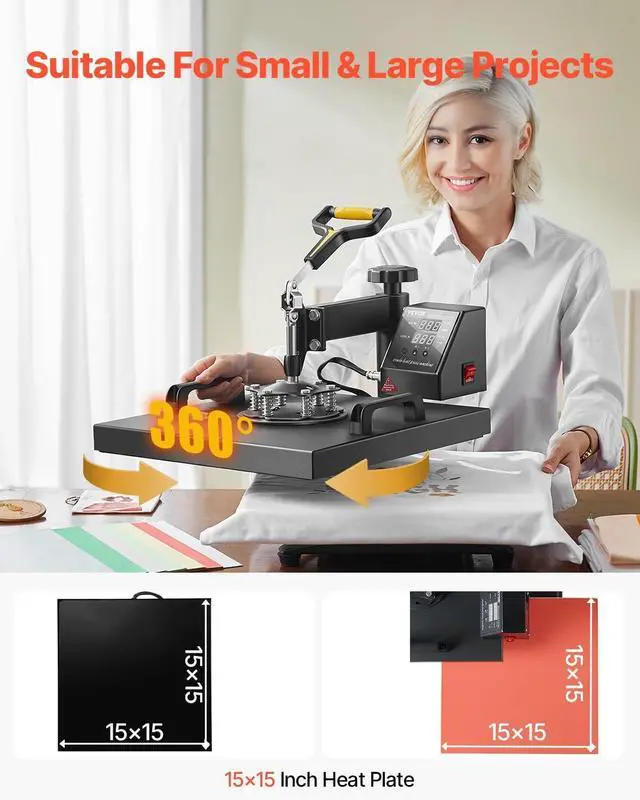 VEVOR 2 in 1 Heat Press Machine for T Shirts and Hats, 15x15 Inch Professional Swing Away Digital Tshirt Press Machine for Sublimation, Vinyl, Heat Transfer Projects