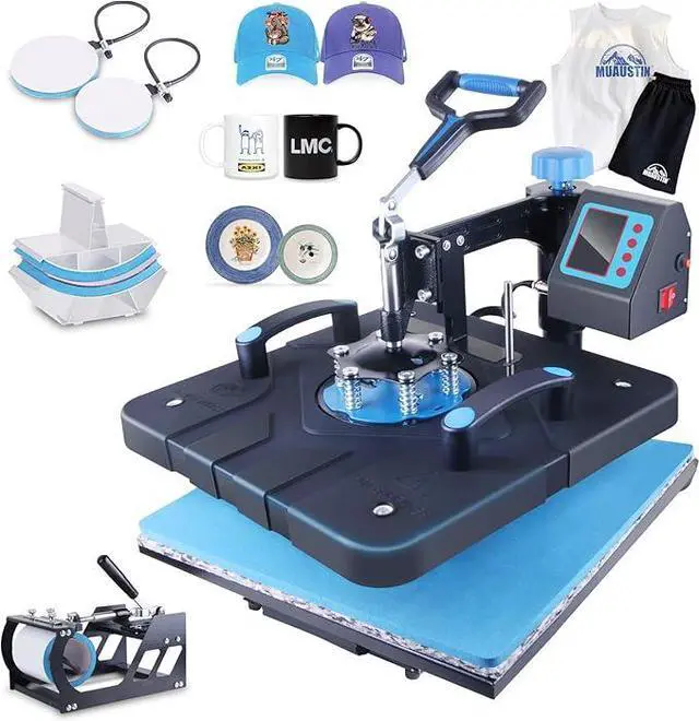 8 in 1 Powerful Multifunctional Press This combo heat press machine comes with 1 x Teflon-coated platen (15 x15 inch), 1 x cap press (5.5 x3 inch, Curved), 2 x Plate Presses (5inch and 6 inch Diameter), 4 x mug press (4.52inch/9OZ, 4.72inch/11OZ,4.92inch/12OZ, 6.49inch/17OZ ), which can be widely used for T-shirts, mugs, plates, hats, and other different materials.
