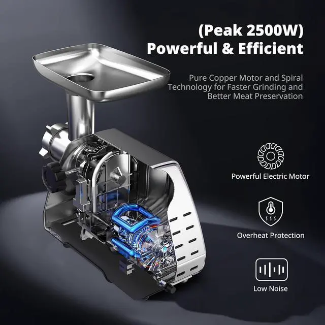 High-Efficiency GrindingThe AIRMSEN electric meat grinder features a 2500W peak power pure copper motor and triple spiral extrusion technology, ensuring efficient cutting and grinding. It can process approximately 2kg of ingredients per minute, effortlessly handling tough meats, vegetables, and fruits. This high-performance meat grinder significantly reduces cooking time while preserving meat freshness and minimizing fiber loss, making it perfect for home kitchens and meal prep enthusiasts