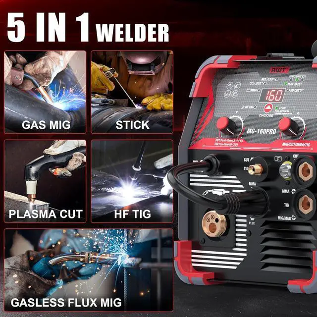 5-in-1 Multifuntion WelderThe AWT welder offers 5 processes: FLUX MIG, GAS MIG,HF TIG,PLASMA CUTTING,and STICK welding, providing a complete solution for various welding and cutting applications. With 110/220V dual voltage, MIG welder perfect for home DIY , farm work and construction sites.