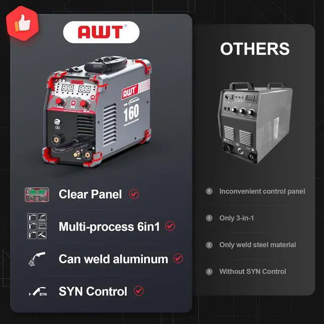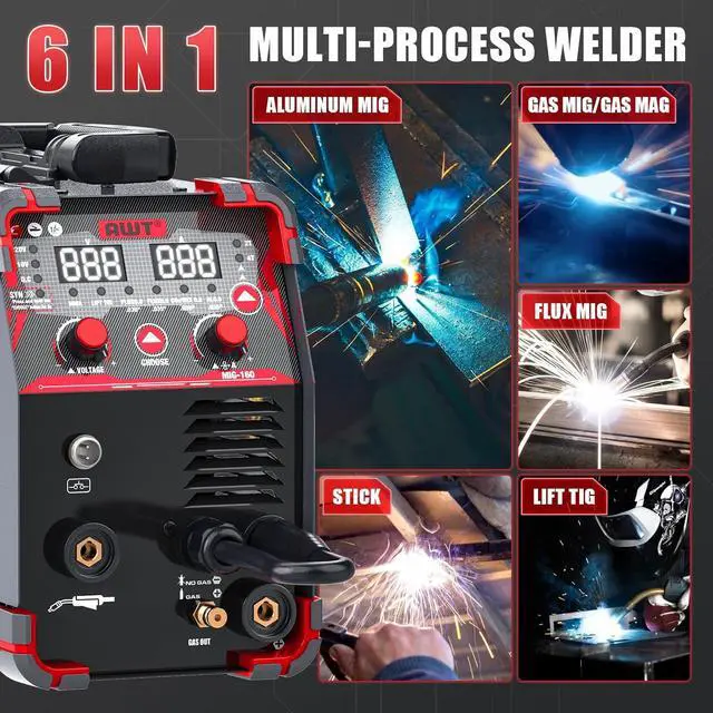 5-in-1 Multifuntion WelderThe AWT welder offers 5 processes: FLUX MIG, GAS MIG,HF TIG,PLASMA CUTTING,and STICK welding, providing a complete solution for various welding and cutting applications. With 110/220V dual voltage, MIG welder perfect for home DIY , farm work and construction sites.