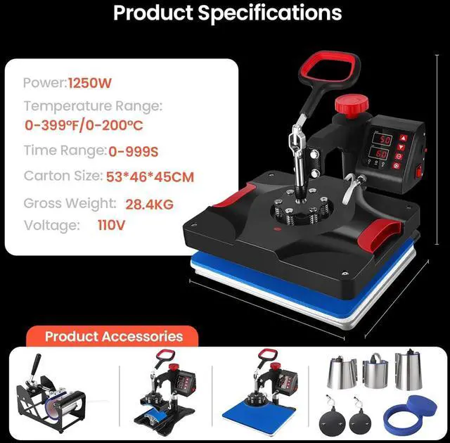 Product Description:8 in 1 Heat Pres Machine include: 15x15 Heat Press Machine for Tshirt x 1pc ; 5.5"x 3" Hat press x 1pc ; 6oz Mug press x 1pc ; 11oz Mug press x 1pc; 12OZ latte mug (Cone) x 1pc ;17OZ latte mug (Cone) x 1pc ; " Plate Press x 1pc ; " Plate Press x 1pc. This heat press comes with a 2-year warranty. With exquisite appearance and fine workmanship, This machine has been recognized and loved by consumers on the market.