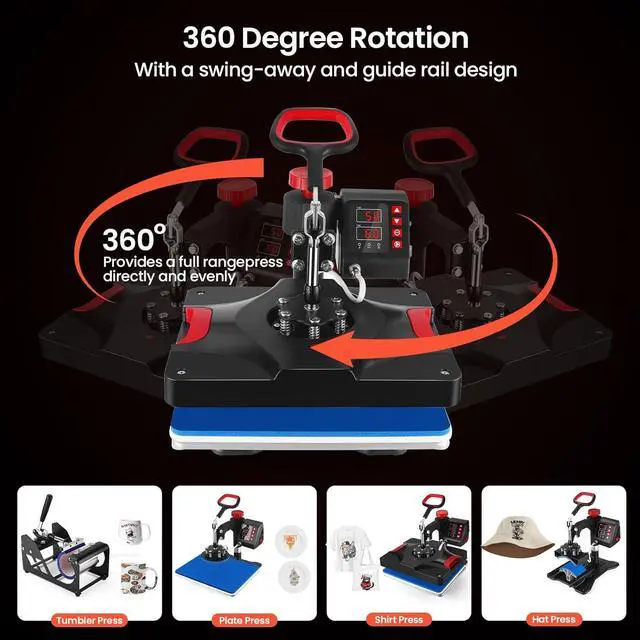 360° Rotation and Guide Rail Design: With a fully rotated 360 degree swing-away and bottom guide rail design, allows the heating element to be moved safely aside, reducing the chance of accidental contact, also make it easy to replace the plate press and hat press. The bottom strong base and top pressure knob make it more stable when using, this heat press machine provides a full range press directly and evenly, guarantees the quality of finished transfers. "