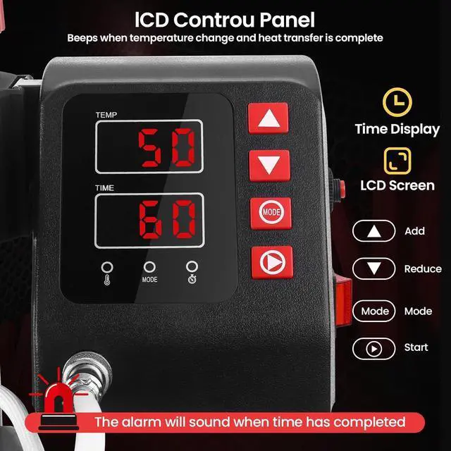 Digital Lcd Control Transfer Temperature Explantion: Separate digital readout for time temperature make operation clearer. easy to operate & control. Unique silicone keys feel comfortable and easy to press! Press (+/-) to switch and °F at will. Improved digital box keeps accurate control of time and temperature, thus brings perfect color to your printing! Dissipate heat and automatically shut off when overheat, ensuring your safe use.