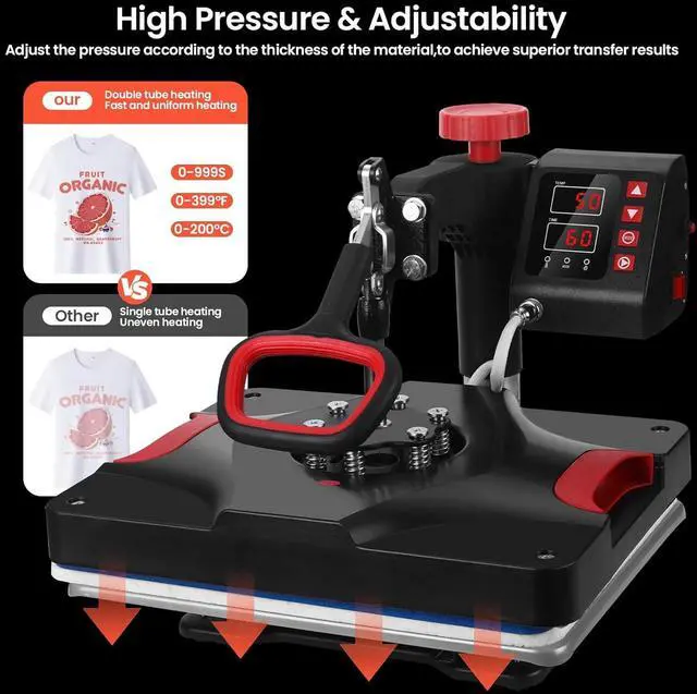 Combination Of Quality And Safety:With improved commercial grade steel frame, heat press can withstand high volume of work with a longer product life.Unlike ordinary single tube heating, our heat press adopts the latest double-tube heating technology. That makes the temperature difference is only about 5 between the center and the edge. But the old-fashioned heating tube is more than 10 . Heating more evenly.thus easy and friendly for beginners. And its also for you business!