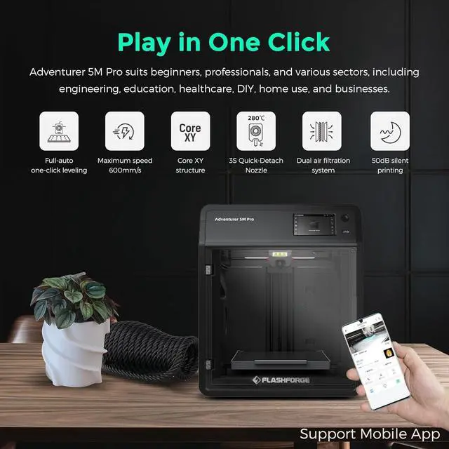 User-Friendly Operation: Unbox to print in 10 mins. Integrated smart management via mobile app-Flash Maker includes remote video monitoring, real-time progress tracking, parameter adjustments, and alerts. Features like auto shutdown, resume printing, and filament detection optimize workflow. Dual circulation system reduces dust, ensuring a safer, more convenient experience, giving you full control with ease.