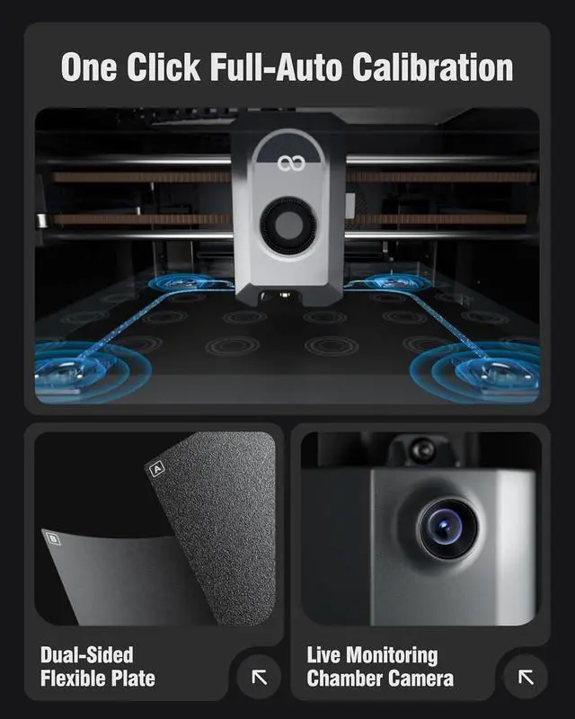 Smart Monitoring & Flawless Printing: Monitor your prints in real time with the built-in chamber camera and dual LED lighting. Capture time-lapse videos and make remote adjustments with ease. The upgraded dual-sided plate features a new PLA Specific Surface with excellent adhesion and minimal warping, ensuring perfect PLA printing even at lower heatbed temperatures