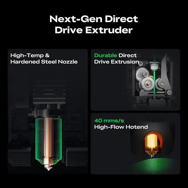 Direct Drive, Pro-Level MaterialsEquipped with a 40 mm³/s high-flow hotend, a hardened steel nozzle (up to 300 °C), and durable direct drive extrusion, K2 Combo handles PLA, ABS, PETG, and even engineering-grade filaments with ease.