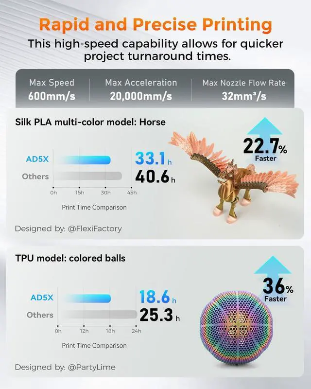 High-Speed Performance - With a maximum printing speed of 600mm/s and an impressive acceleration of 20,000mm/s, the FLASHFORGE AD5X delivers rapid and precise printing. This high-speed capability allows for quicker project turnaround times, catering to both professional and personal printing needs while maintaining exceptional print quality.