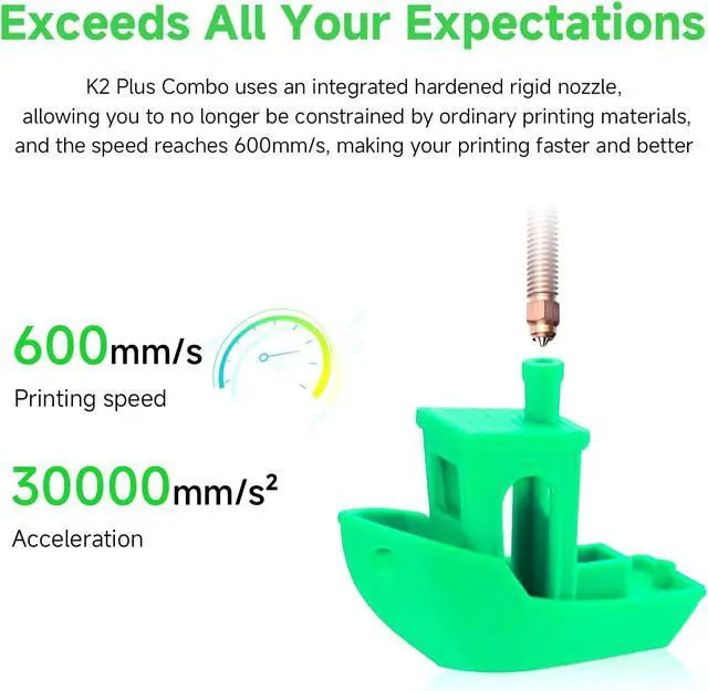 Industrial-Grade Speed & PrecisionDominate deadlines with 600mm/s lightning-fast printing and industry-leading 30,000mm/s² acceleration. K2 Plus Combo equipped with step-servo motor system and 40mm³/s high-flow hot-end delivers rapid production without compromising detail quality 2-3X faster than standard large-format printers
