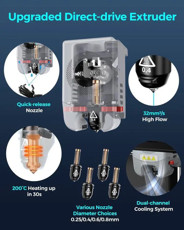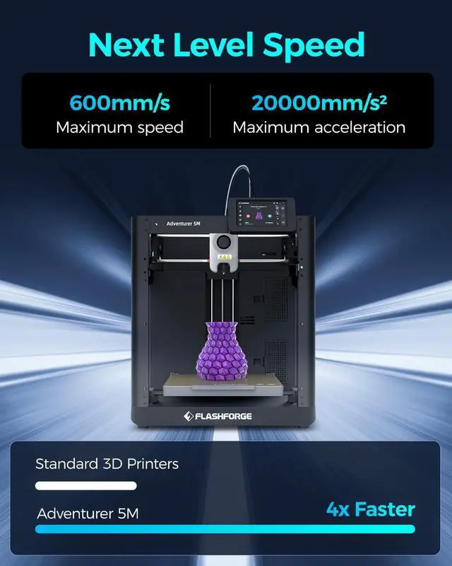 High-Speed Printing & Maximum Efficiency. Achieve lightning-fast print speeds up to 600mm/s and acceleration of 20,000mm/s². With a high-flow nozzle (32mm³/s) and rapid 35-second heating to 200°C, reduce wait times and boost productivity.