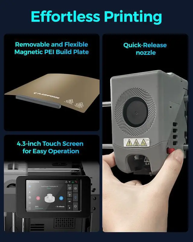 Smart Features for Enhanced Usability. Upgrade your workflow with a quick-release nozzle, flexible PEI build plate, resume printing function, and four nozzle size options. Seamlessly control prints via Orca-Flashforge and Flash Maker App for a smarter 3D printing experience.
