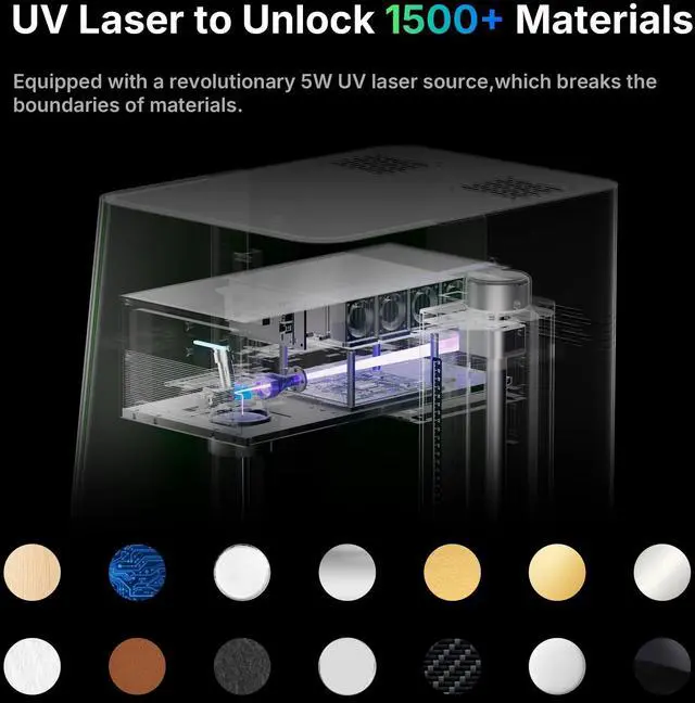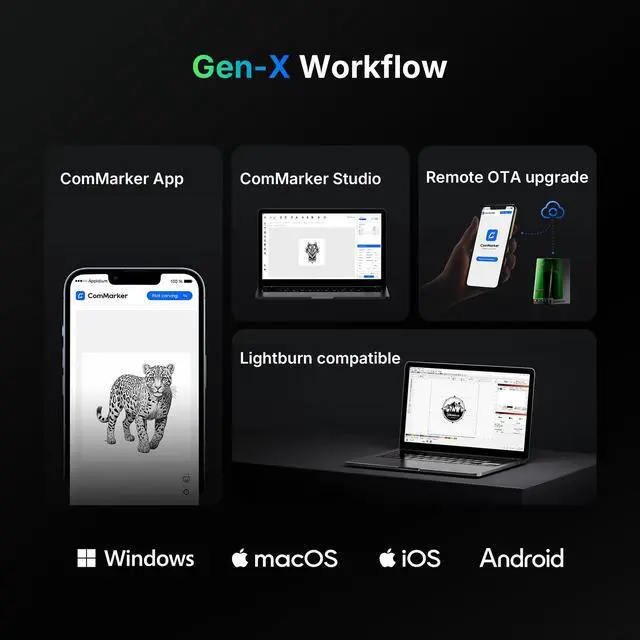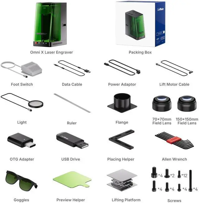 The ComMarker Omni X UV Laser Engraving Machine offers advanced engraving capabilities with a focus on precision and user convenience. Featuring a newly upgraded focusing system, it utilizes LiDAR technology, an electric lifting column, and one-button auto-focus to streamline setup and eliminate manual adjustments. Its compact and lightweight design makes it suitable for various workspaces.
