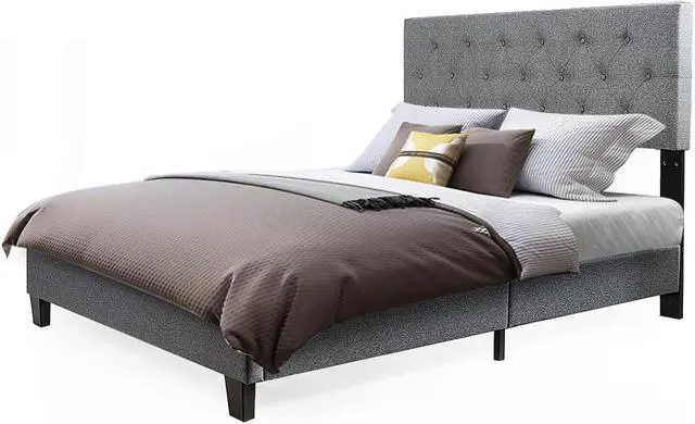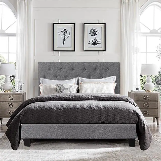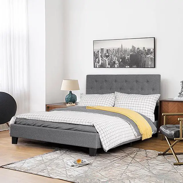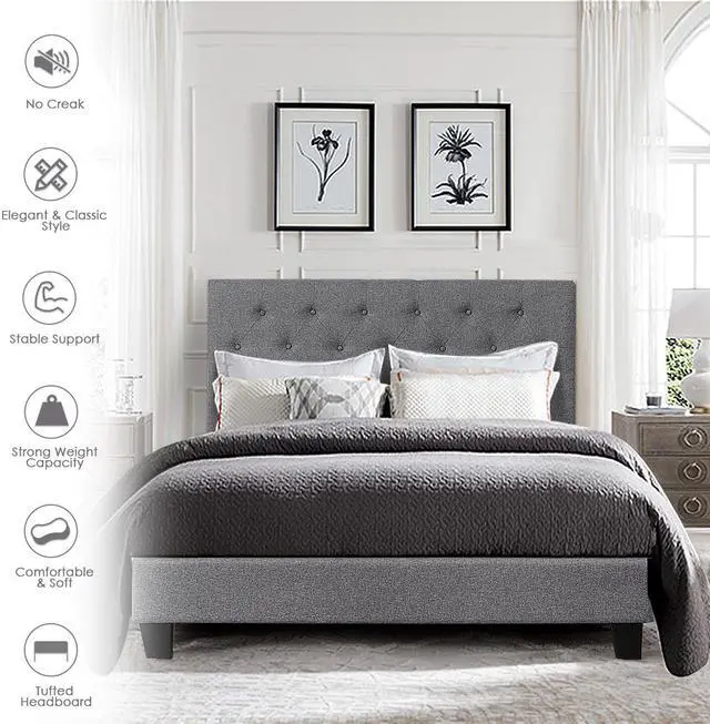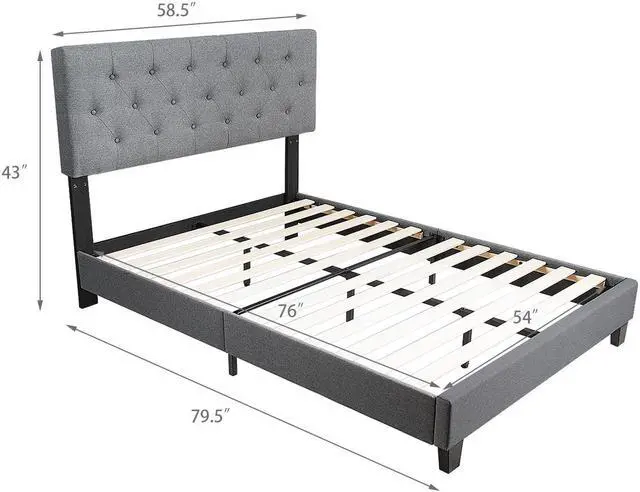 Add attraction and elegant to any space with this full size platform bed. Featuring an rectangle tufted headboard with soft coves, this bed is a beautiful and comfortable combination. And the unique and concise headboard and low -profit footboard make it be the perfect centerpiece for the bedroom However, it not only pleasing the eye but comforting your body. Adopts durable steel and thick wooden slats, this bed is durable and has enough weight capacity for you. Besides, padded side rails are not only protect you but increase warm touch. All you need to do is purchase this bed and enjoyment after assembling.