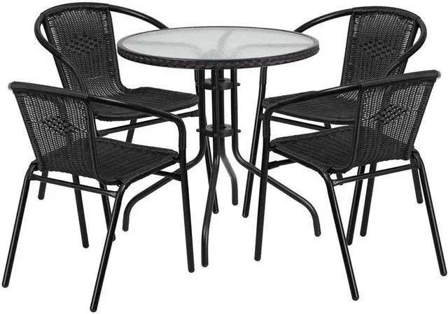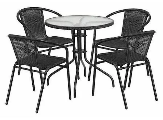 If you love hosting family and friends on your deck or need extra seating for the new dining patio of your cafe, this set is just what you need. The table's rippled designer glass top has a smooth surface for keeping items level. The rattan edge band complements the chairs and adds just the right touch. The lightweight chairs feature a curved back, comfortable rattan seat and integrated arms. Cross braces provide extra stability when sitting and these sturdy chairs hold up to 352 lb. weight capacity. For easy storing and cleaning purposes these chairs stack up to 23 high. This set was designed for all-weather use making it a great option for indoor and outdoor settings. For longevity, care should be taken to protect from long periods of wet weather. Whether you are just starting your business or upgrading your furniture this set will complete the look.