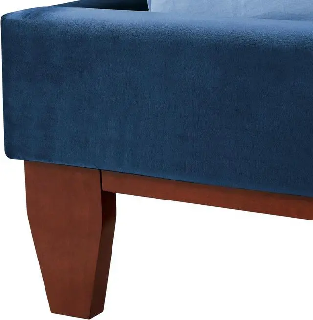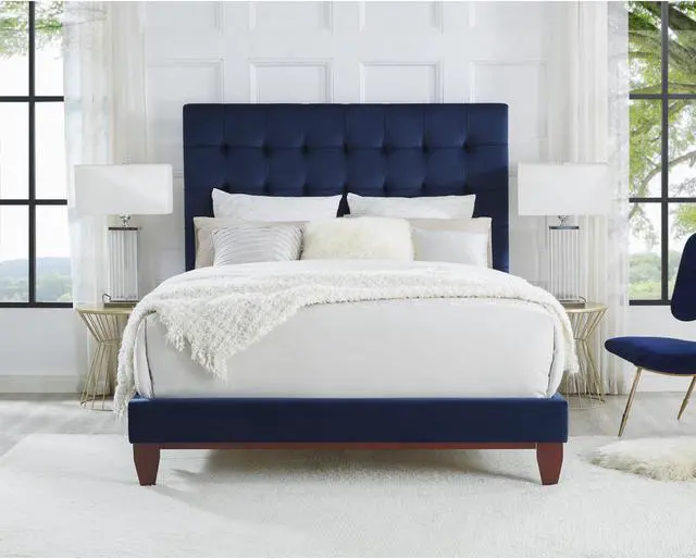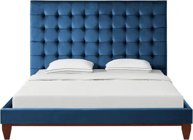 Our velvet bed frame adds a measure of modern sophistication and elegance to your bedroom. Get the feeling of laying your head down each night in a upscale five star hotel room. This stylish bed frame features exquisite velvet, a button tufted high density foam padded headboard, and tapered solid wood legs to provide a luxurious end to your day.