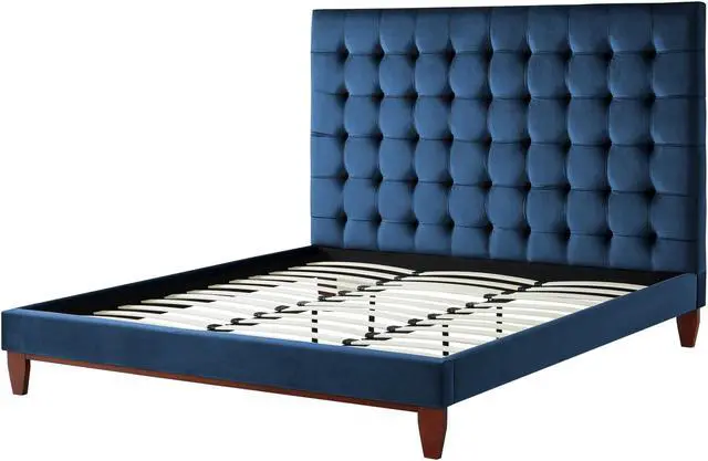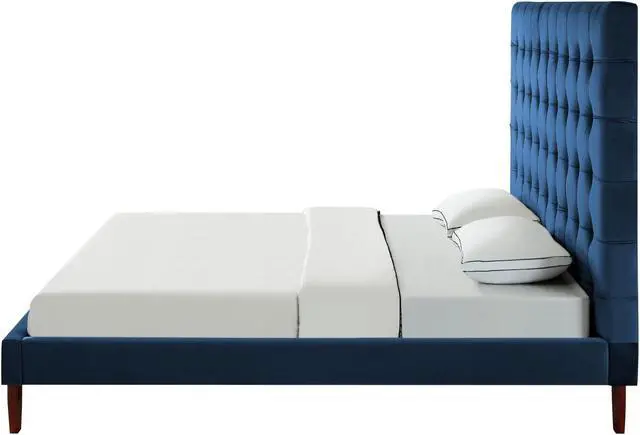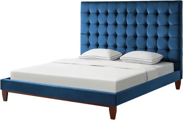 Our velvet bed frame adds a measure of modern sophistication and elegance to your bedroom. Get the feeling of laying your head down each night in a upscale five star hotel room. This stylish bed frame features exquisite velvet, a button tufted high density foam padded headboard, and tapered solid wood legs to provide a luxurious end to your day.